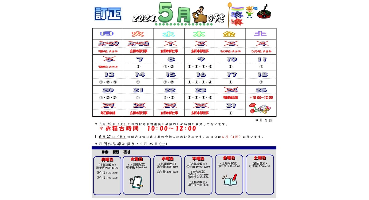 5月の予定、最初にお配りした予定表から数カ所変更がありますのでご注意ください。